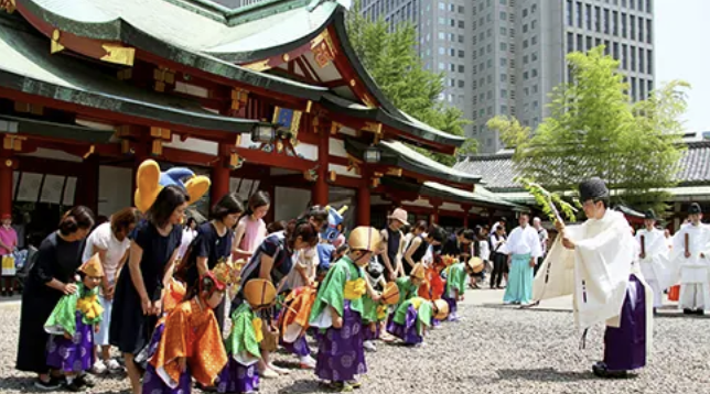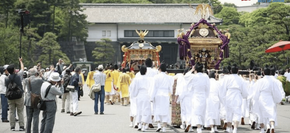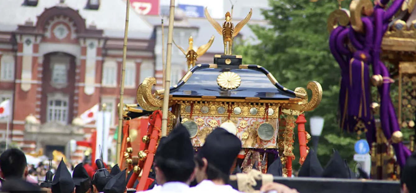수많은 참가자들이 전통 의상을 입고 히에 신사로 가는 길을 따라 행진하며, 화려하게 장식된 미코시를 들고 도심을 누빕니다.